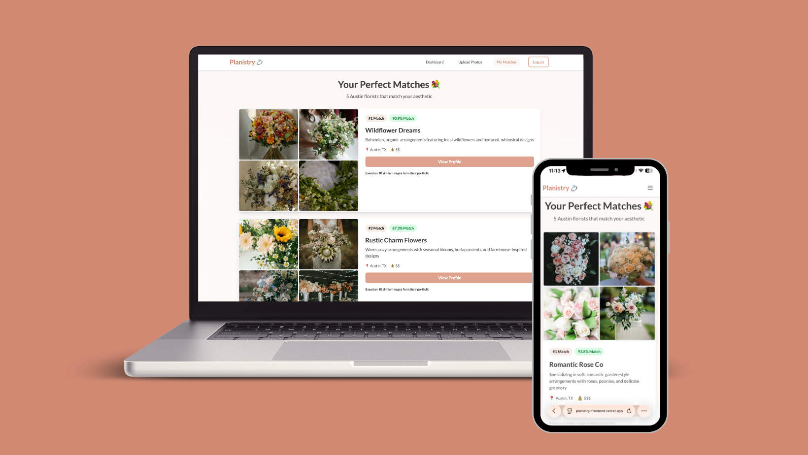 Responsive matches view: Desktop navigation collapses to a hamburger menu on mobile, while vendor recommendations remain clear and scannable at any screen size.