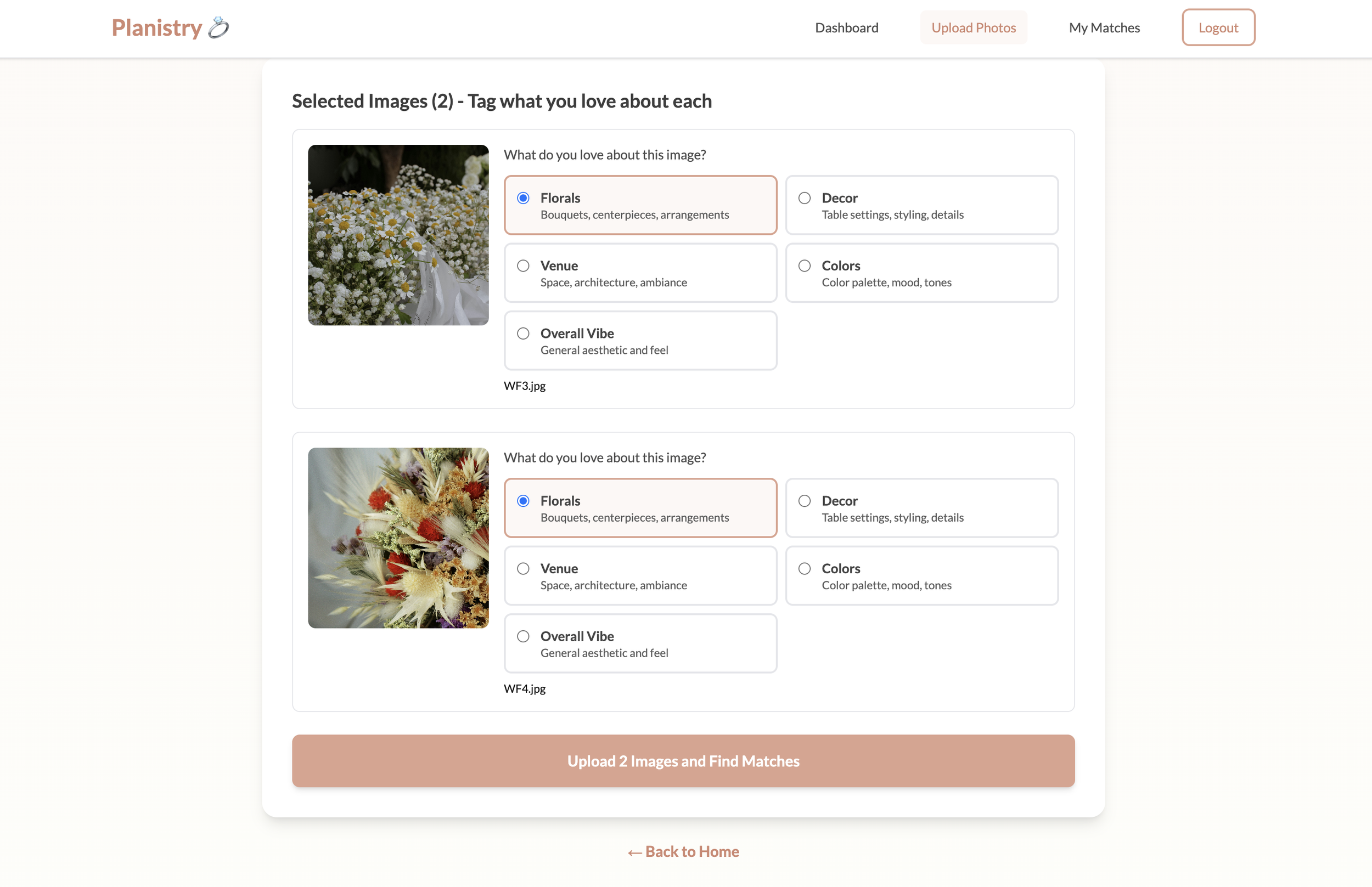 Upload and tag: Couples control what the algorithm weights by tagging specific elements they love in each inspiration photo.