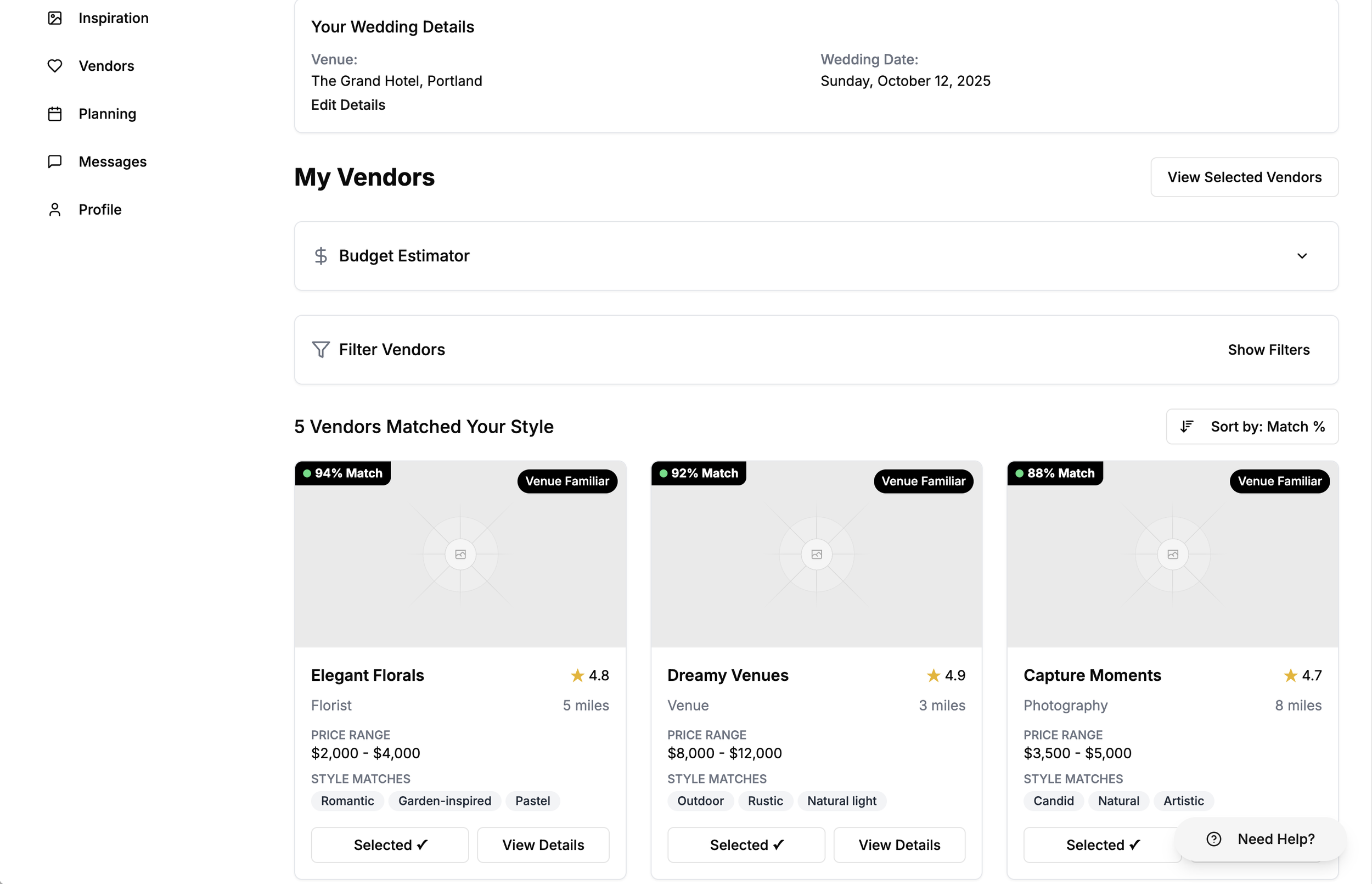 Couples can tag what they love to improve match quality, while venue-based filters surface vendors with relevant experience. A built-in planning assistant provides helpful prompts and guidance throughout, breaking big decisions into smaller, confidence-boosting steps and keeping the experience clear, personal, and stress-free.