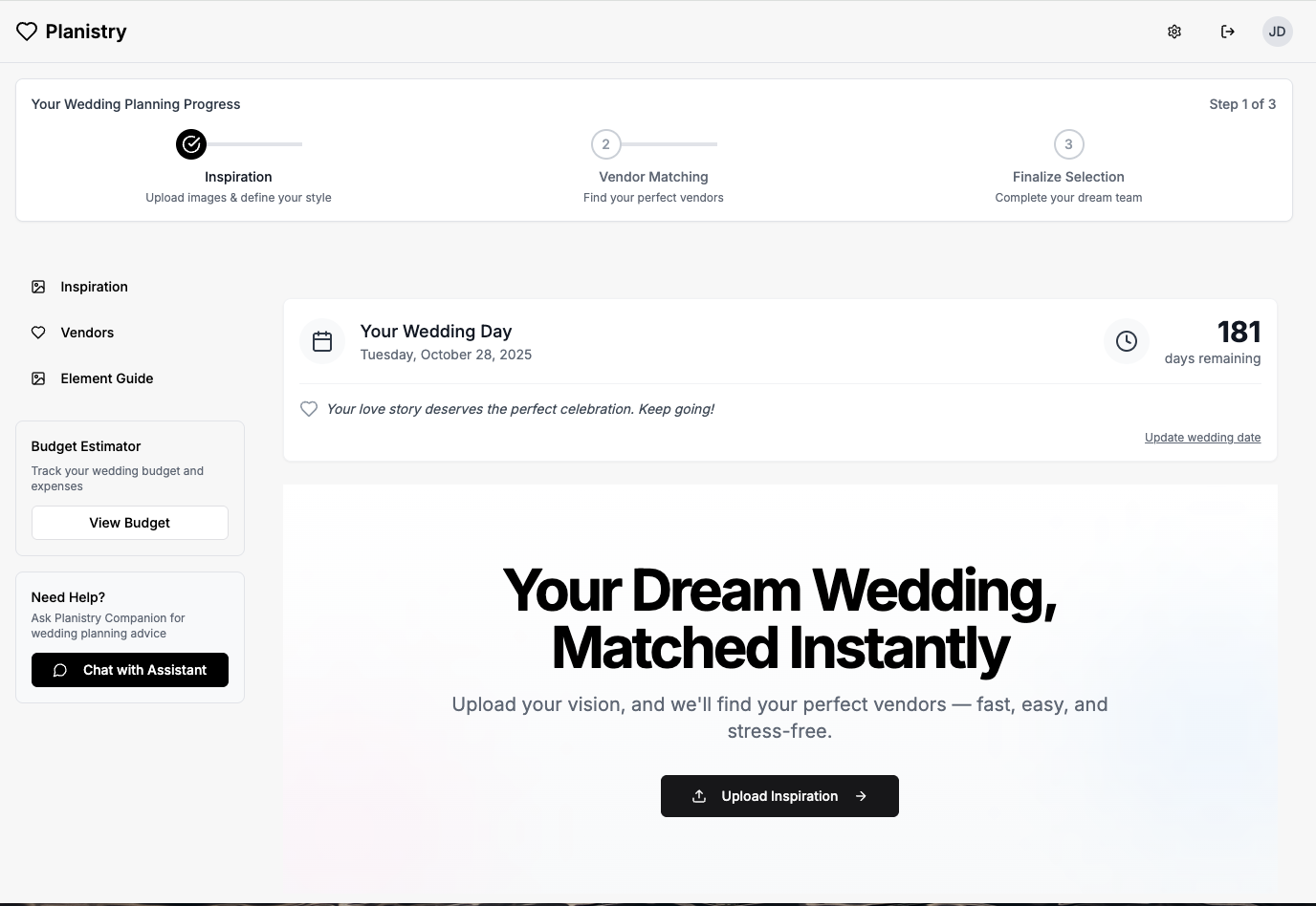 Planistry transforms the vendor discovery process into a visual-first, AI-powered experience. Couples simply upload their inspiration images and are matched with local vendors who align with their style and vision, making the journey from concept to decision effortless.